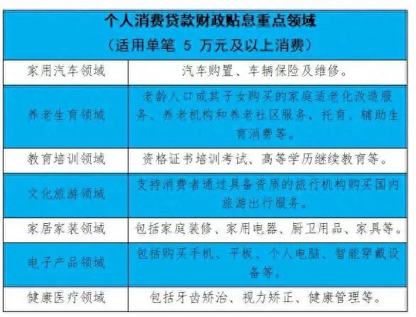 1.贴息范围包括:单笔5万元以下消费,以及单笔5万元及以上的家用汽车、养老生育、教育培训、文化旅游、家居家装、电子产品、健康医疗等重点领域消费。