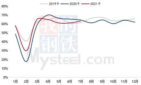 图7:2019-2021年中国再生铜制杆企业产能利用率