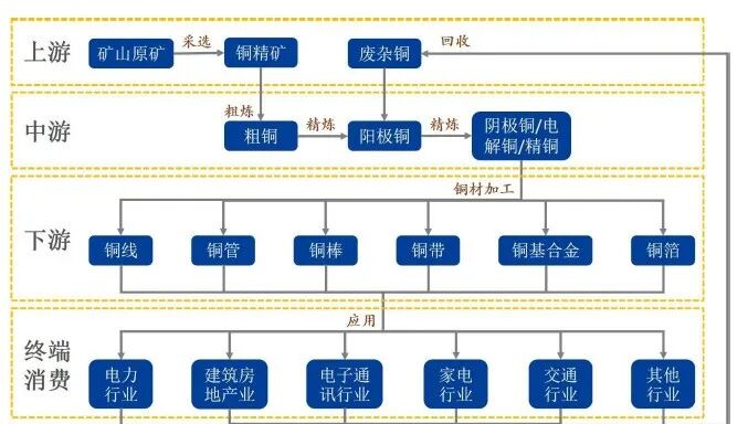 而铜产业链的下游,是铜的终端应用领域,覆盖电力、建筑、家电、交通运输、电子信息、新能源等多个行业。