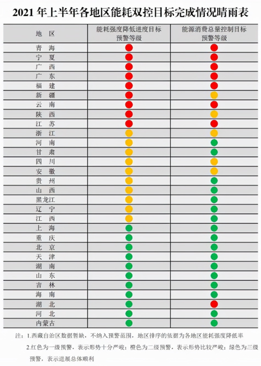 最后的原因,也是我们一直在说的,碳中和,节能减排。我们来看下面这张图,应该是大家近期阅读文章里出镜率很高的一张图。这张图,你一看就明白了。现在限电严重的省份都是达到了红色预警的。双绿情况的省份用电情况没那么严重,都挺好的。