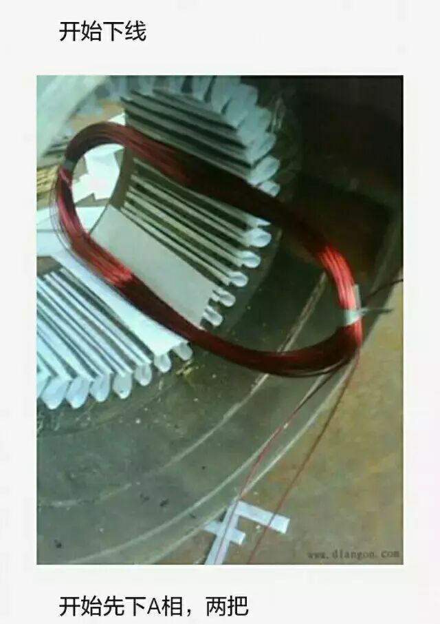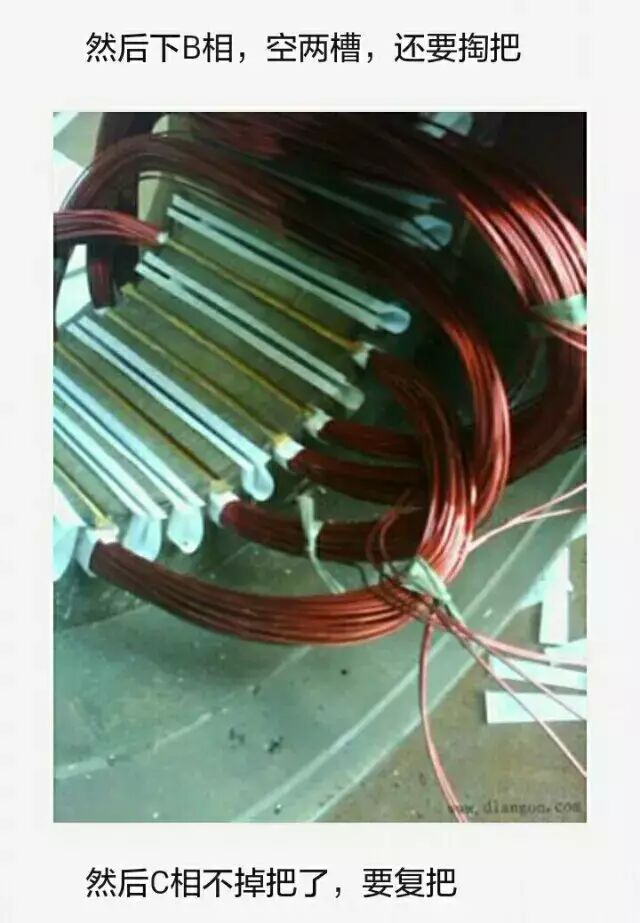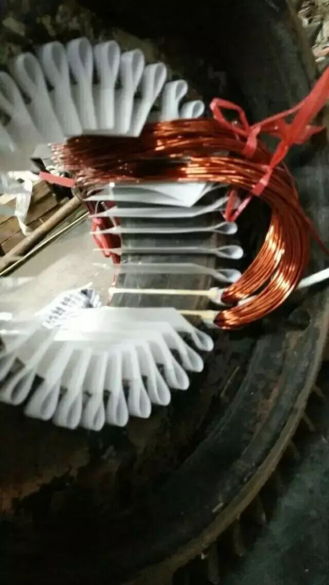 效边全部嵌入槽内。如果尚有未嵌入的导线有效边部分,可用划线片将该部分逐根划入槽内。导线嵌入后,用划线片将槽内导线从槽的一端连续划到另一端,一定要划出头。这种梳理方式的目的,是为了槽内导线整齐平行,不交叉。然后再把层间绝缘(对双层绕组)摺成"∩"形,插入槽口包住槽内导线。对线圈未嵌入的另一有效边则采取吊边。