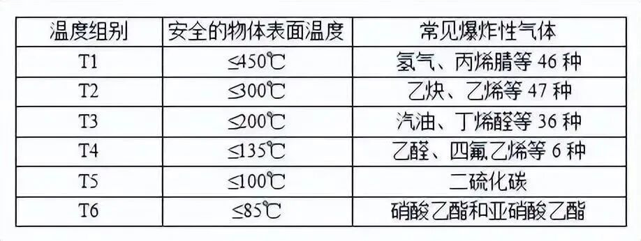 按设备最高表面温度分为T1至T6六个组,具体如下图: