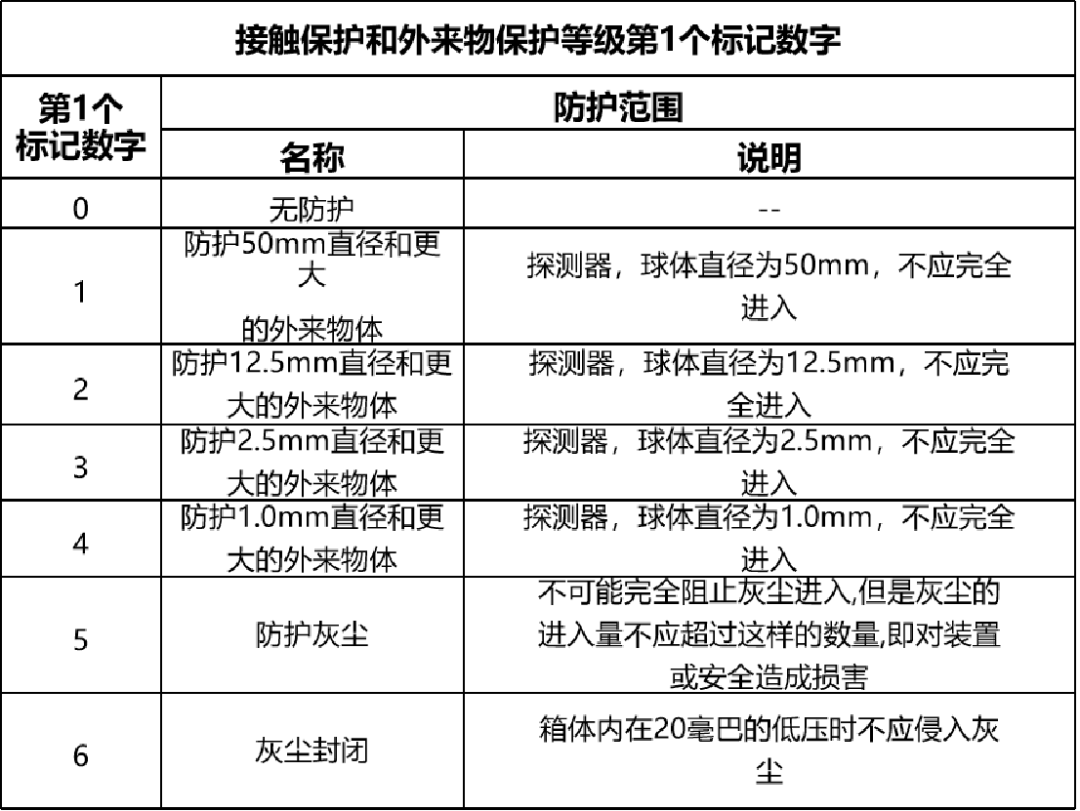IP防护等级是由两个数字所组成,第1个数字表示电器离尘、防止外物侵入的等级,第2个数字表示电器防湿气、防水侵入的密闭程度,数字越大表示其防护等级越高。
