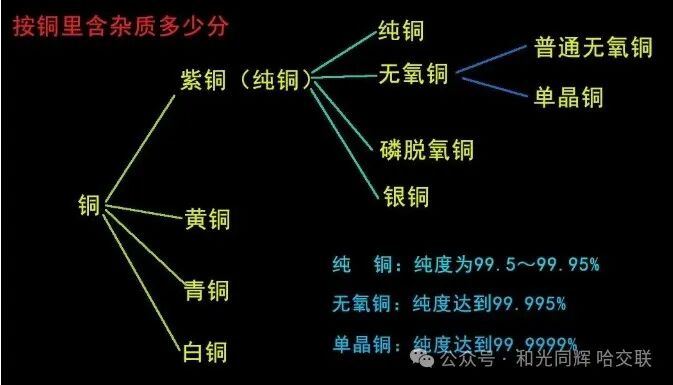 根据含氧量和杂质含量,无氧铜又分为一号和二号无氧铜,一号无氧铜纯度达到 99.97%,氧含量不大于 0.003%,杂质总含量不大于 0.03%;二号无氧铜纯度达到 99.95%,氧含量不大于 0.003%,杂质总含量不大于 0.05%。
