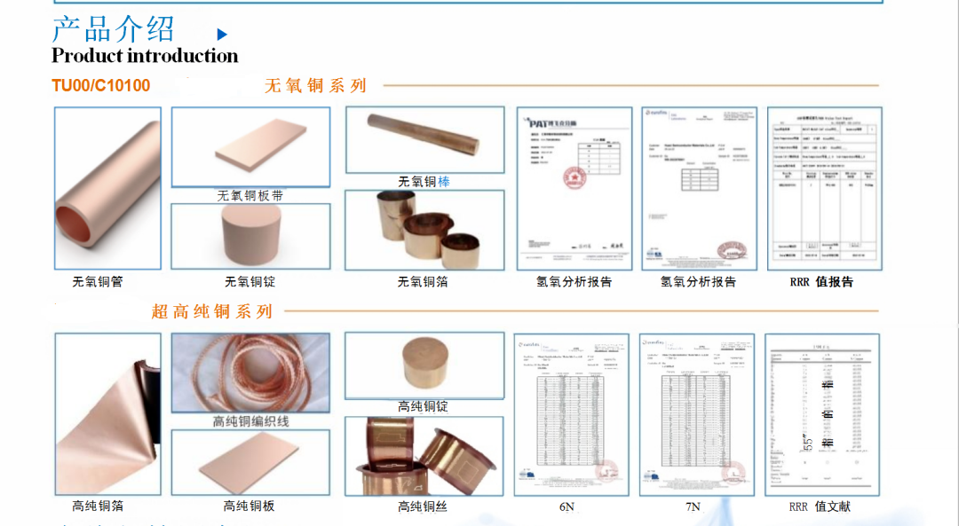 金川集团高纯无氧铜产品:采用工频感应加热炉,配套铜板预热炉,立式半连续铸造机,最大有效出铜量8t,可生产长度6000mm的铸锭,新建真空立式连续铸造无氧铜生产线,已成功研发出纯度99.995%以上,氧含量3PPM以下的高纯无氧铜产品。应用于溅射靶材、先进医用装备、新能源汽车等行业。