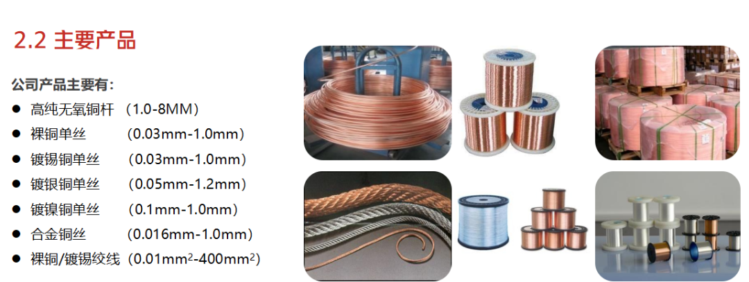 公司设备配备年产4万吨高纯无氧铜杆的上引法生产线5套、年产5000吨合金铜杆的进口上引炉1套、年产7万吨连铸轧铜杆生产线1套;还有700余台各类铜导体深加工设备,年产各类铜丝4万吨,主要产品有铜杆裸铜丝、镀锡铜丝、合金铜丝、绞铜丝、并丝铜丝产品等系列产品。
