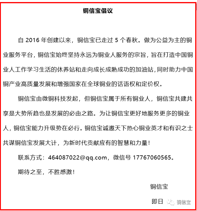 提示:点击上方"铜信宝"↑关注最新资讯