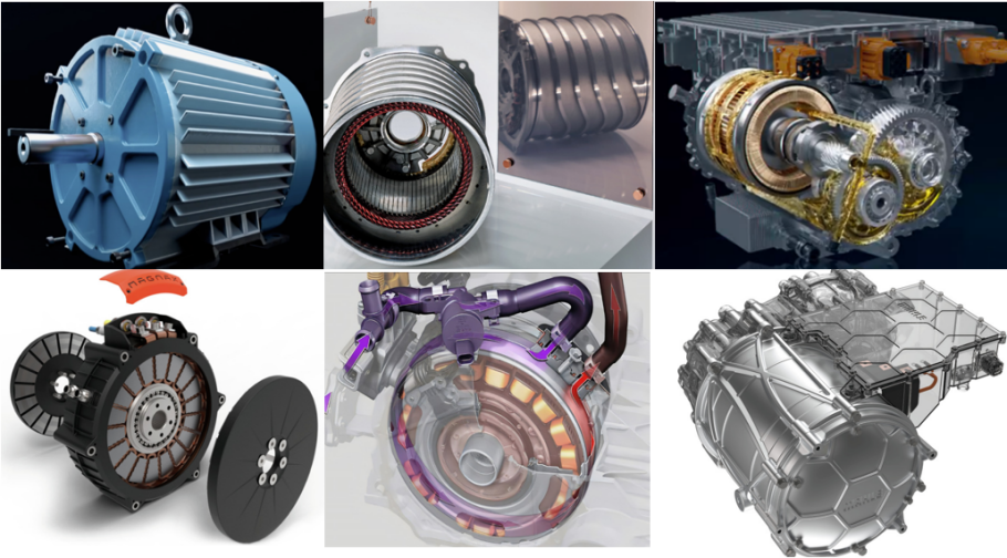 轴向磁通电机:比利时Magnax公司的产品减少电机重量、尺寸和成本。他们的设计旨在把转子和定子齿部的空气间隙减到最小。电机使用了SRS的方式,两个转子,各位于定子的一边。在这种配置中,定子支撑起电磁齿轮,但并不充当转子的支撑或轭。轭是一个占定子质量三分之二的钢制圆筒。若没有轭,电机重量可大大减轻,该公司估计这一做法可让电动汽车续航能力提升7%。