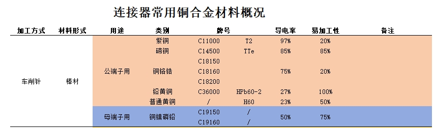 不同的连接器类型需要不同的导体材料,对应也需要不同的加工类型,下表大概整理了下按不同的加工方式,按材料导电率排序下,连接器常用的铜合金牌号,供大家在设计连接器的时候参考选择。