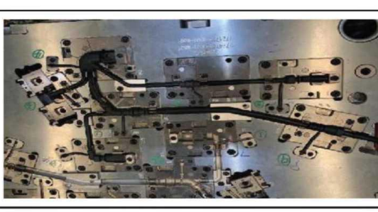 解决措施:线束加工过程中,管线要摆放平整,无扭转的安装在注塑模具上,然后才能注塑加工,如图3所示。或者模具设计不合理,需要重新设计验证模具,调整合适的注塑件角度。