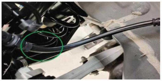 轮线束装配好后,汽车进行整车强化坏路耐久试验,试验完毕后,拆卸检查轮线束,发现线束动态区有折痕,如图 5所示。根据以往经验,折痕是不被允许的,有折痕的轮汽车线束后续肯定会失效。