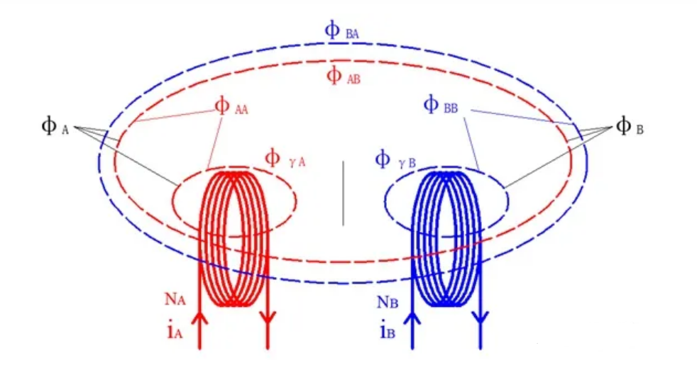 φA,φB为A,B线圈中的总磁通;φAA,φBB为A,B线圈自身通入电流产生的磁通;φBA为由线圈B产生并穿过线圈A的磁通;