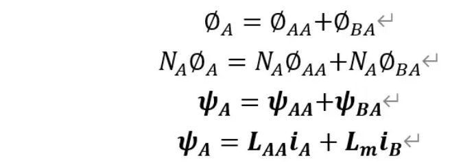 ψA,ψB为A,B线圈中的总磁链;ψAA,ψBB为A,B线圈自身通入电流产生的磁链;ψBA为由线圈B产生并与线圈A匝链的磁链。