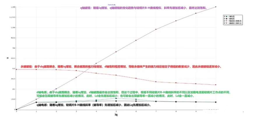 ②q轴磁链:随着iq增加,q轴磁链的变化趋势与硅钢片B-H曲线相似,斜率先增加后减小,最终达到饱和。