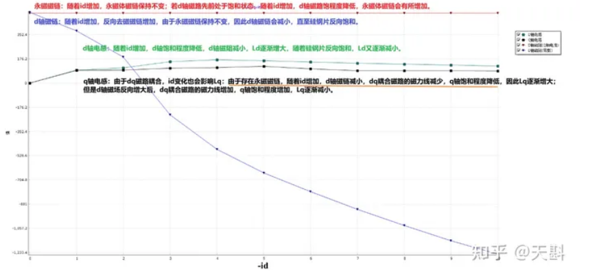 ②d轴磁链:随着id增加,反向去磁磁链增加,由于永磁磁链保持不变,因此d轴磁链会减小,直至硅钢片反向饱和。