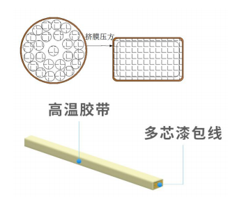 膜包压方线的结构外层是高温胶带,内层是多芯漆包线或成品铁氟龙绝缘线,耐温特性优异。其通过成品膜包线挤膜压方而成,工艺过程中新增加了压方工序,使得各股线间隙更小,整线密度更高。